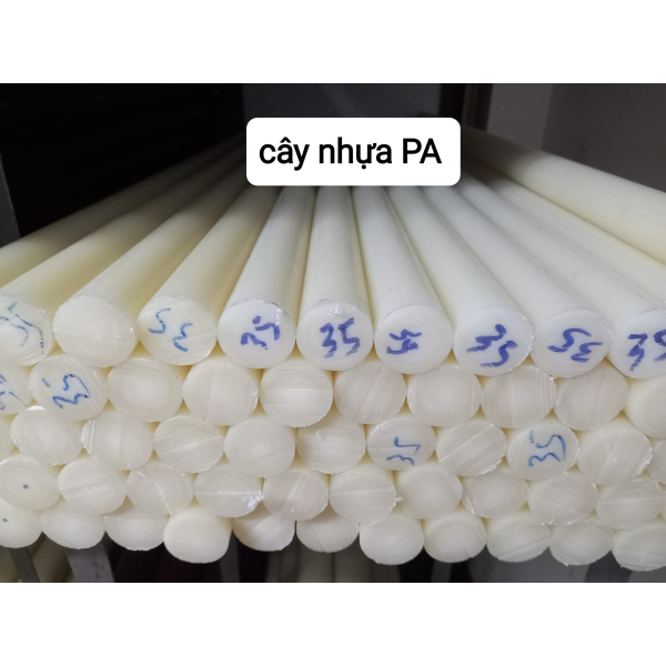 Nhựa PA cây tròn đặc phi 10, 15, 18, 20, 25, 30, 35, 40, 45, 50, 60, 70, 80, 90, 100 tới 300mm, chiều dài 1 cây 1000mm được sản xuất từ hạt nhựa PA nguyên sinh với độ cứng cao, chịu được nhiệt độ cao, có tính chất chống thấm, chịu mài mòn tốt và không phản ứng hầu hết với các hóa chất. Với những đặc tính nổi trội như trên nên cây nhựa PA được gia công thành bánh răng nhựa, thớt kê, tấm đệm, thanh đệm, vòng đệm chịu lực, chịu mài mòn trong các dây chuyền sản xuất, dây chuyền vận chuyển nguyên liệu. Đặc biệt là dùng nhiều trong công nghiệp chế biến thực phẩm và được dùng nhiều trong sản xuất gia công nội thất.
